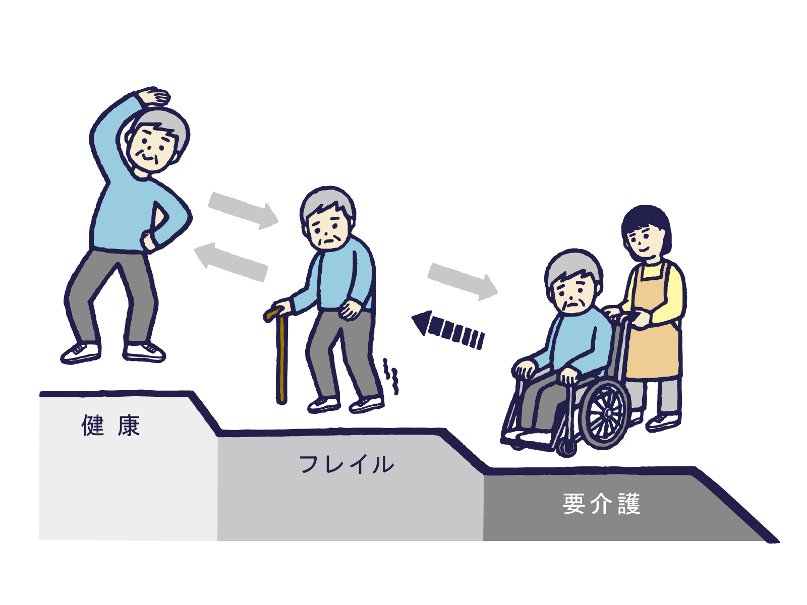 フレイルとは、主に高齢者において問題となる体力や活動力の低下を指す言葉です。